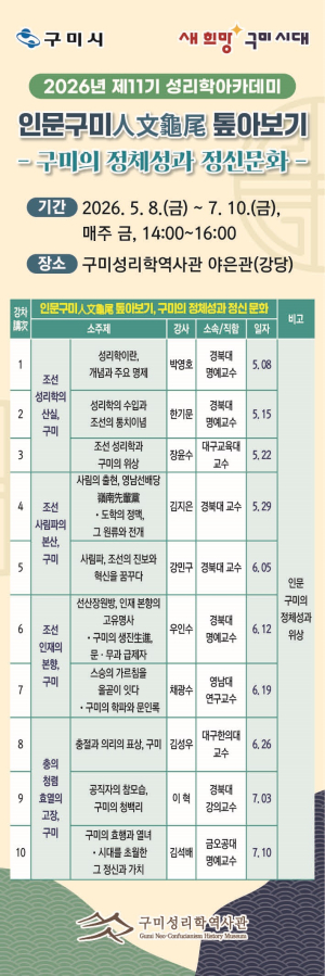 강좌는 오는 5월 8일부터 7월 10일까지 매주 금요일 오후 2시부터 4시까지 운영된다. 박사급 이상 전문 강사를 초빙해 조선성리학의 산실’, ‘조선사림파의 본산’, ‘조선인재의 본향’, ‘충의·청렴·효열의 표상’ 등 구미가 지닌 인문적 가치를 다각도로 조명한다. 이를 통해 15세기 이후 이어온 인문도시로서의 위상을 재확인하고, 시민들의 자긍심을 높이는 데 초점을 맞췄다.