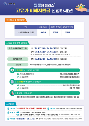 구미시는 고유가와 물가 상승으로 인한 시민들의 경제적 부담을 완화하기 위해 고유가 피해지원금 1차 신청·접수를 오는 27일(월)부터 시행한다.